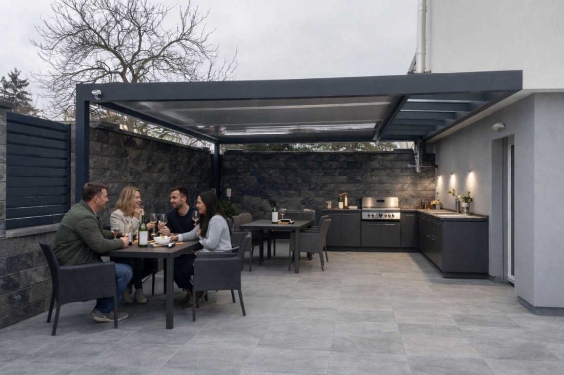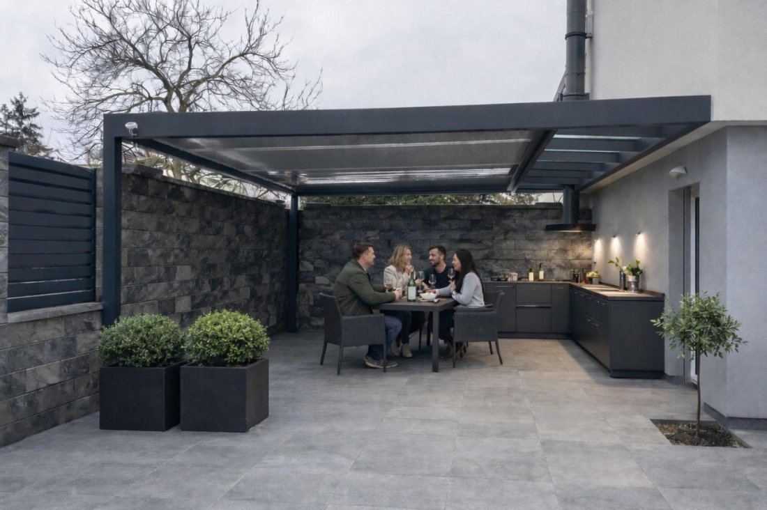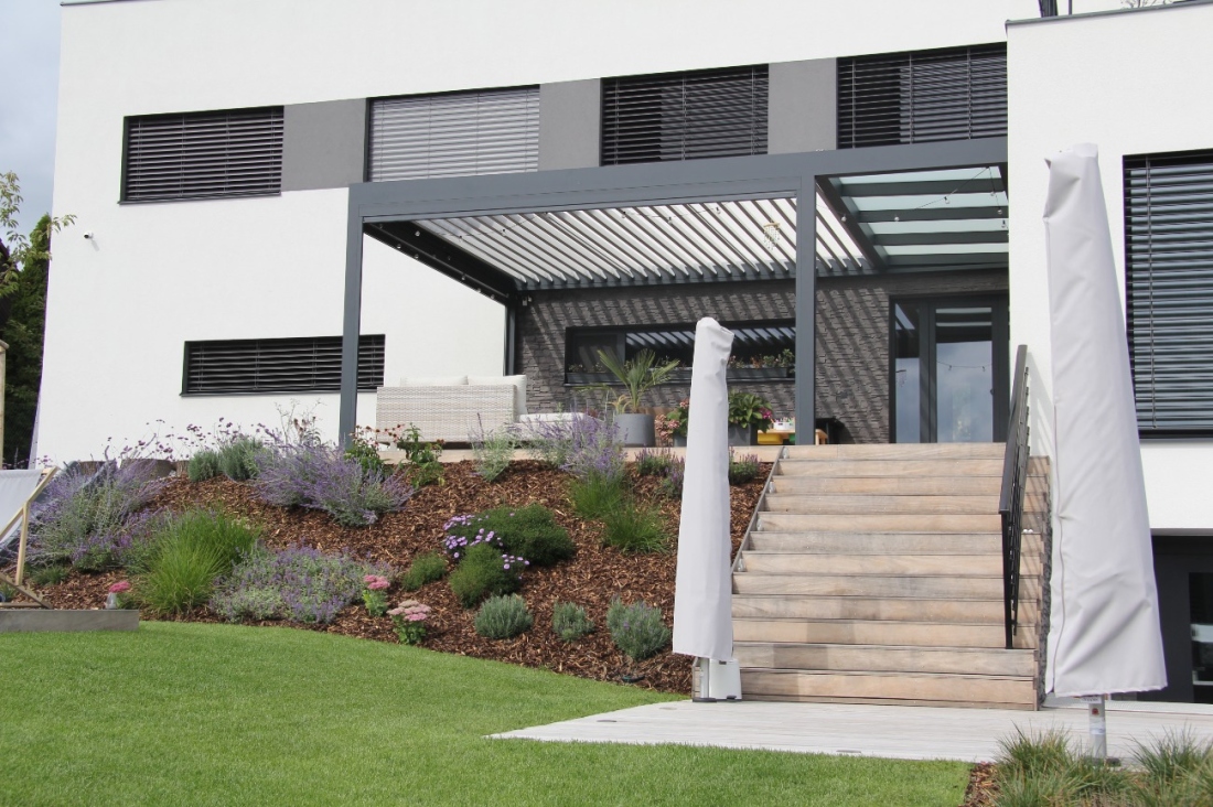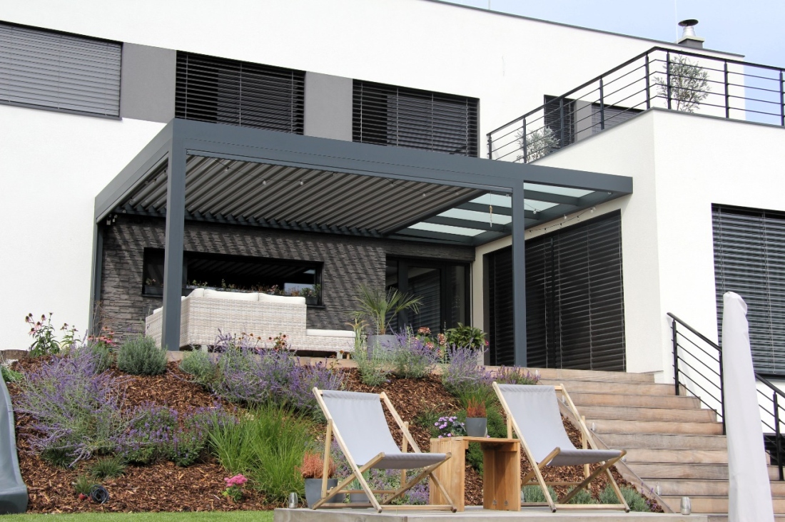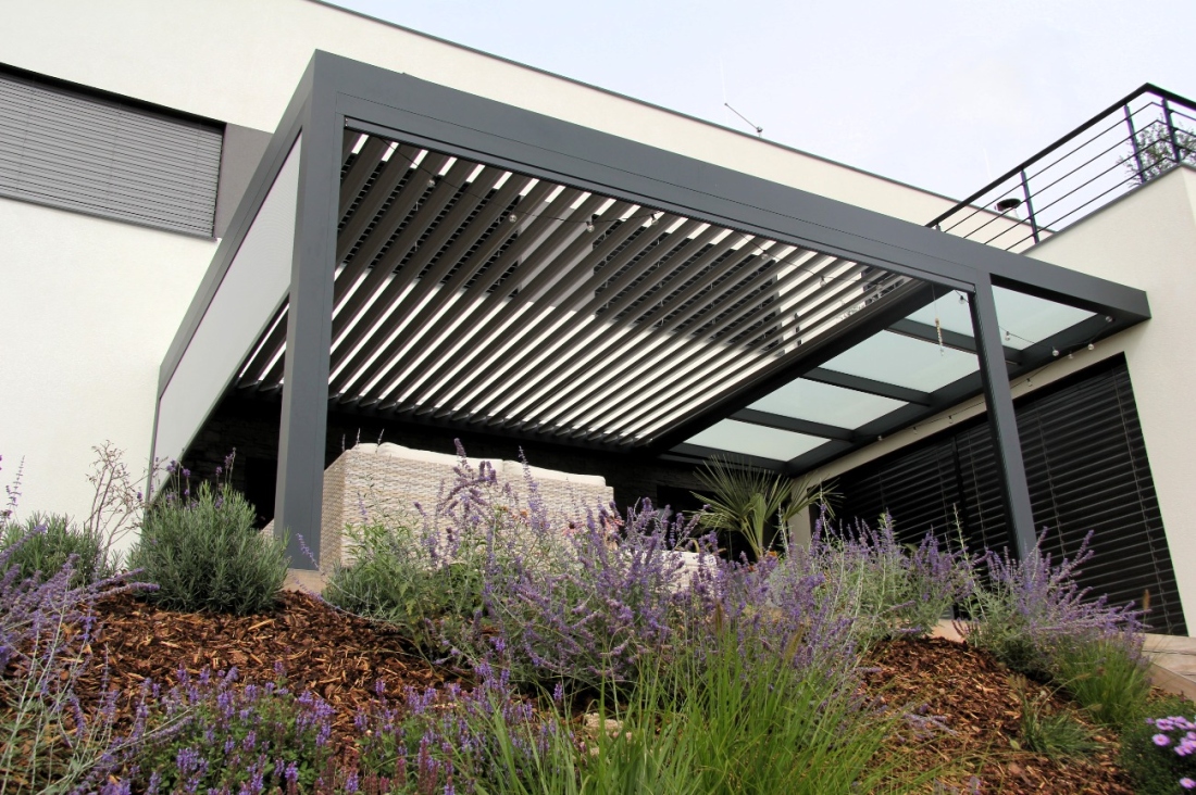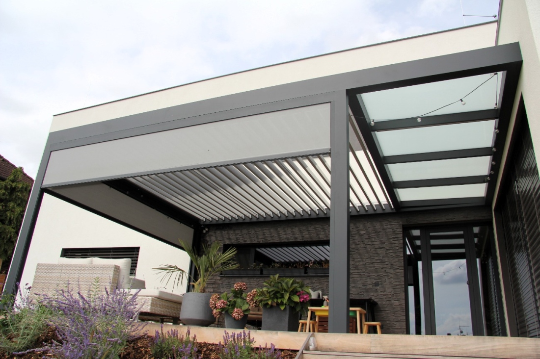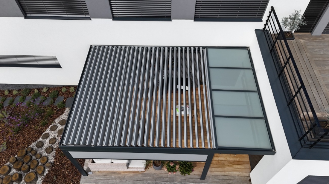 Prosvětlovací pás integrovaný do rámu bioklimatické pergoly. Unikátní systém, který není realizovaný ze dvou samostatných pergol.